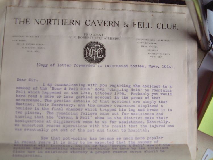The CRO was the first rescue organisation of its type. It was formed in 1935 following an incident in Gingling Pot in October 1934 when a member of the Moor and Fell Club fell and broke his leg. He was successfully rescued after spending 29 hours underground, but shortly afterwards a meeting was convened in Norman Thornber's house to discuss the establishment of a rescue corps to handle future incidents. It was attended by representatives of half a dozen senior clubs, and chaired by E.E. Roberts, President of the Northen Cavern and Fell Club and a long-standing member of the Yorkshire Ramblers Club. As a result the Central Rescue Organisation was established with Norman Thornber, Reg Hainsworth, and Godfrey Wilson being appointed the first wardens. It changed its name to the Cave Rescue Organisation in 1938. The first part of the collection includes all the material from this period. The early history of the CRO is well documented in the book "Race Against Time" by Jim Eyre and John Frankland.